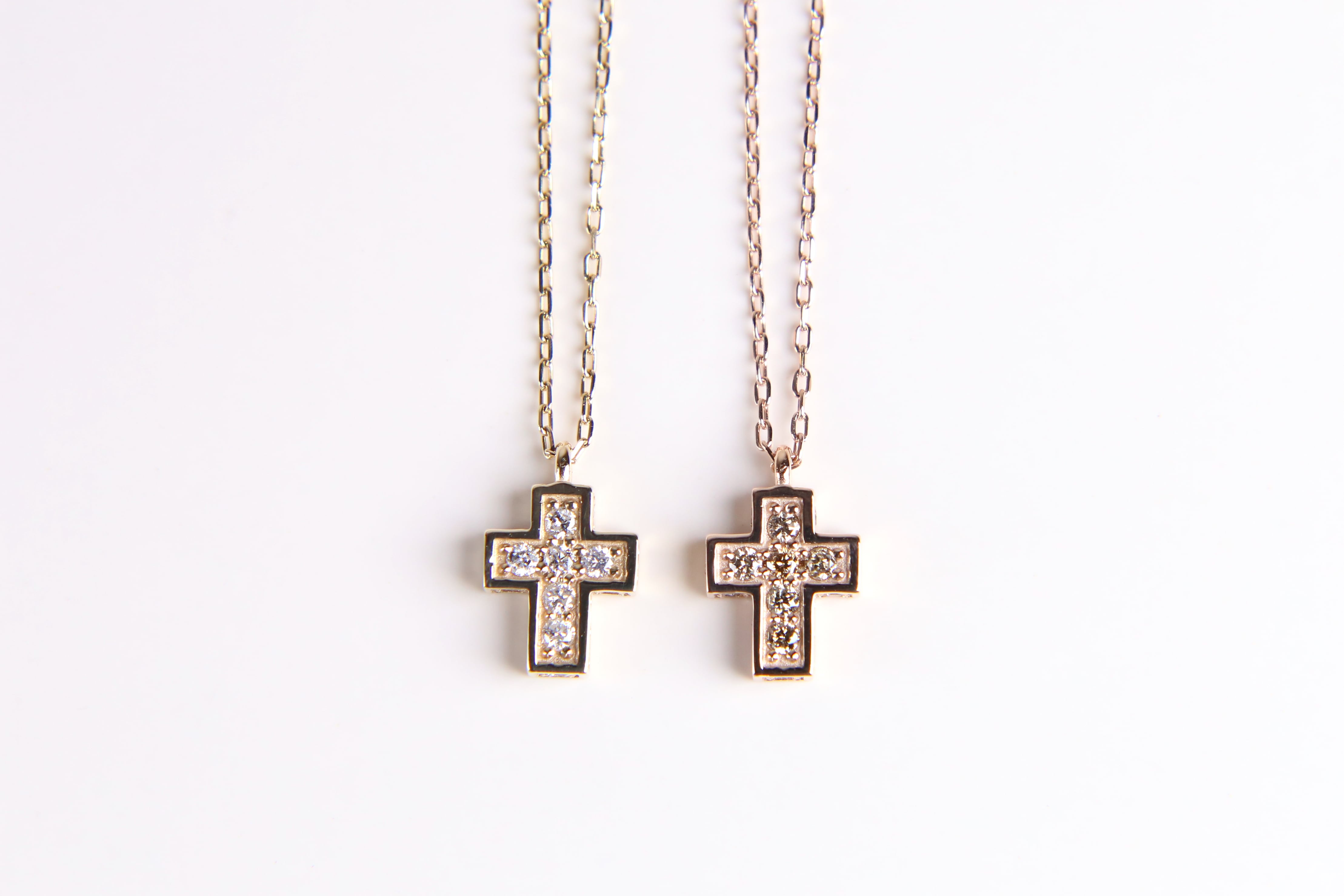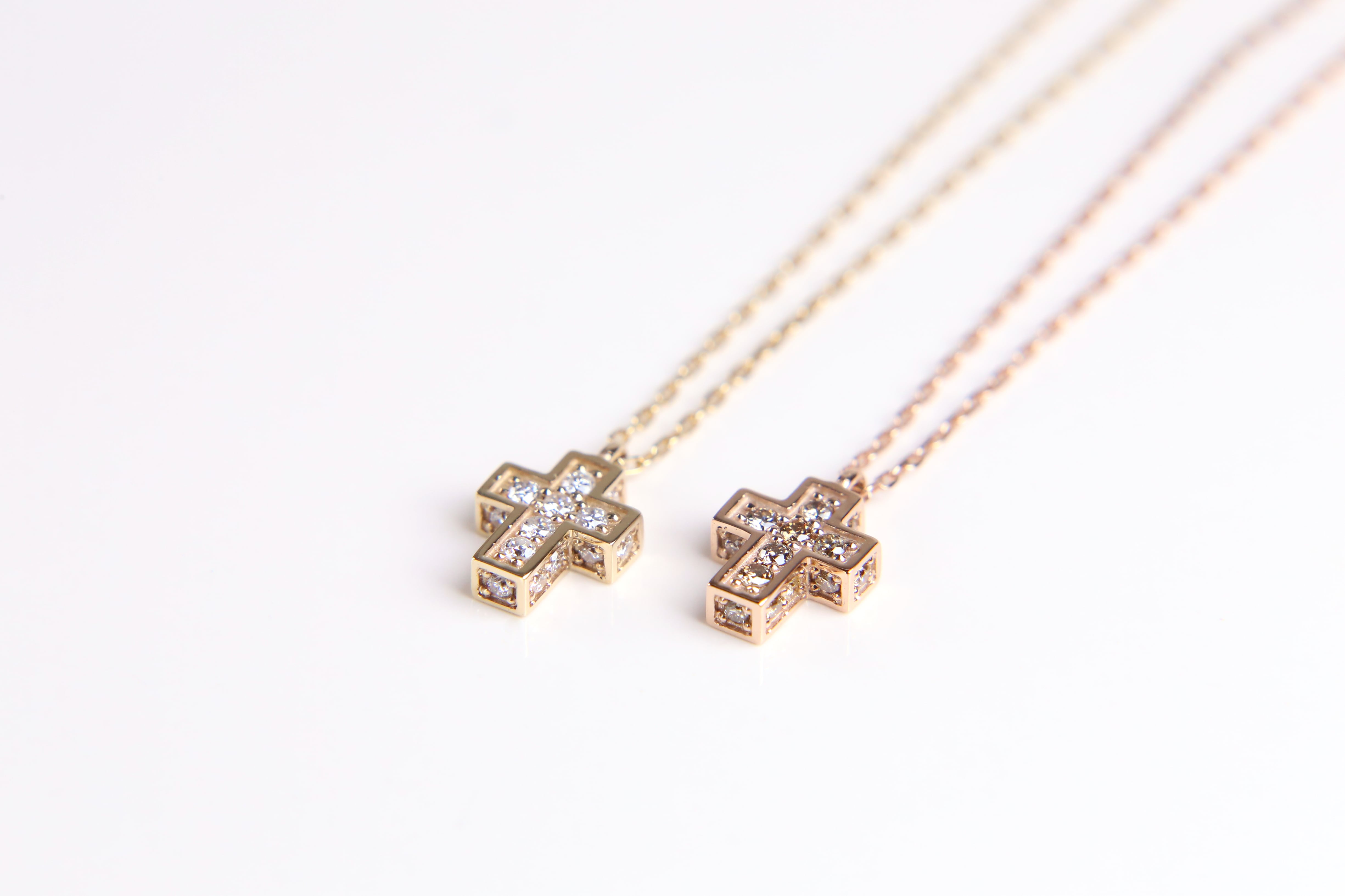 立方体で形成されたクロスモチーフは、正面だけでなく側面にも各場面にダイヤを纏い、小さいながらも存在感を示す、どこから見ても可愛らしく美しいペンダントです。