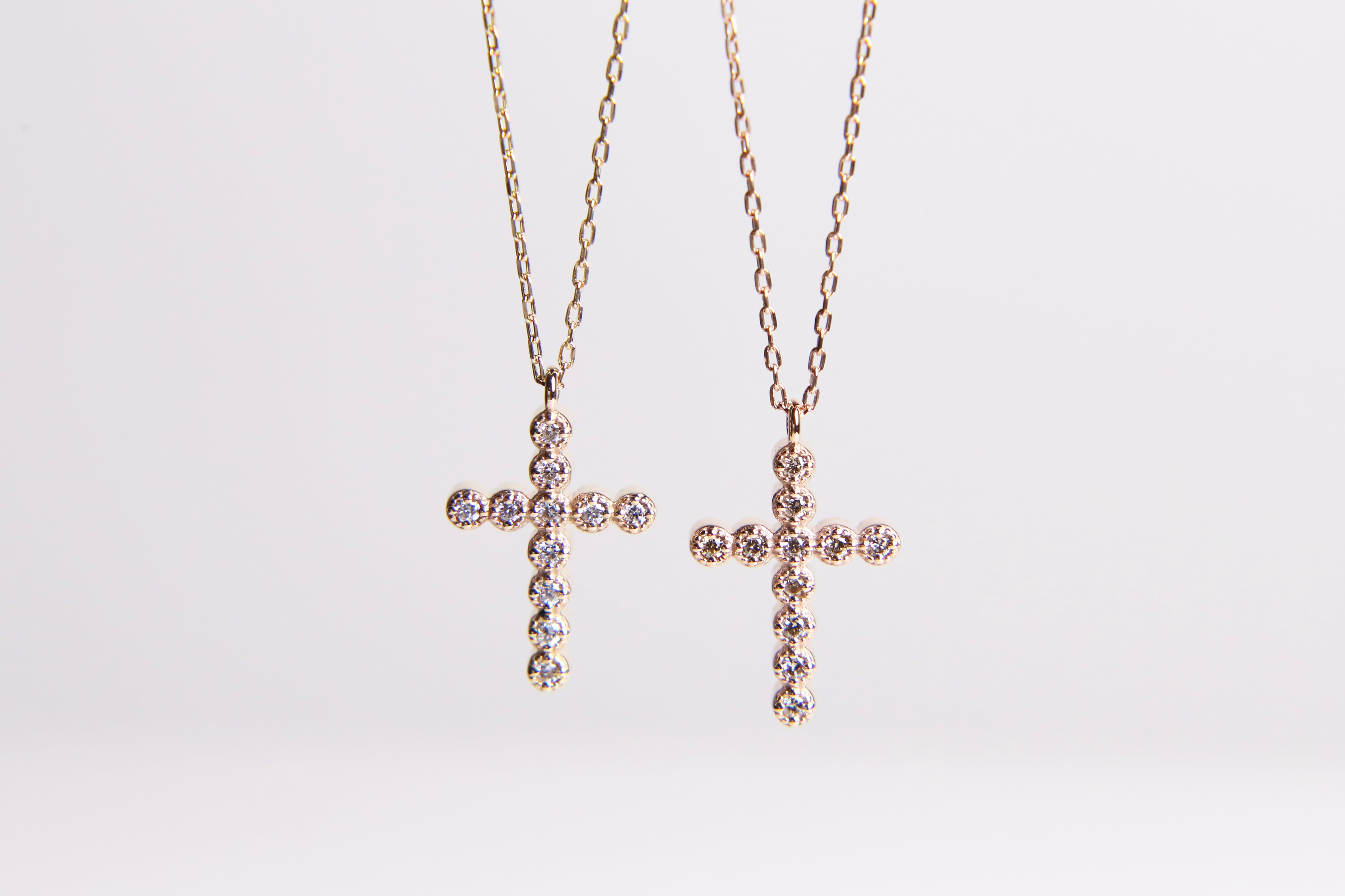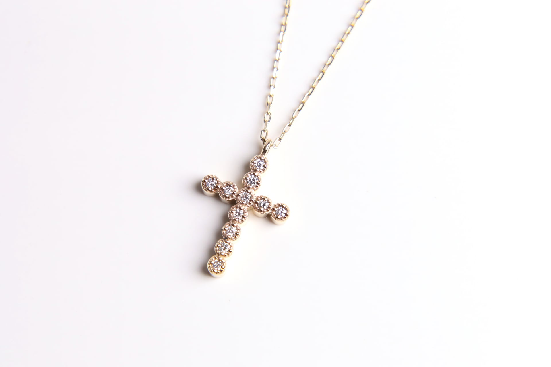 独立したダイヤモンドがミルグレインに囲まれ、美しくアンティークな雰囲気を漂わせるtsumugiシリーズのクロスペンダントです。