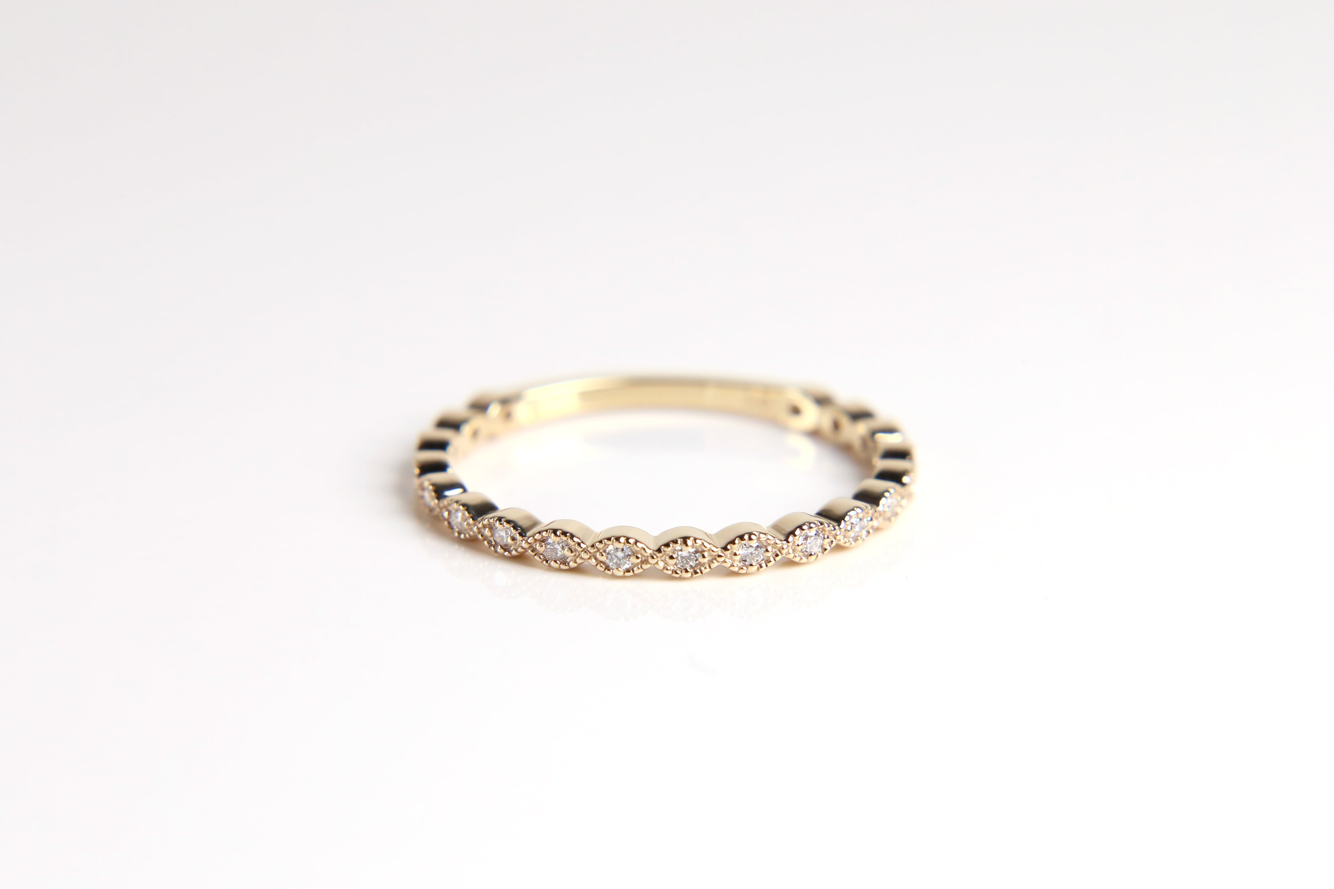 独立したダイヤモンドがマーキス形のミルグレインに囲まれ、美しくアンティークな雰囲気を漂わせるtsumugiシリーズのハーフエタニティリングです。